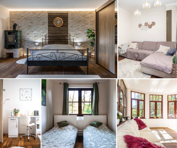 A két külön zárható hálószobánkban egy db franciaágy, két db egyszemélyes ágy, ill. a nappalinkban egy tágas ülőgarnitúra található, így összesen akár 4+1 guests is kényelmesen elfér. Minden helyiségünk hűtő-fűtő klímával felszerelt. A pihenés mellett az orchideákkal díszített télikertünk nemcsak egy jó könyv olvasására tökéletes, de a nagy sávszélességű internet miatt home office céljára is kiváló. Kényelmi felszereléseink közé tartozik a SMART TV Netflix csomaggal, társasjátékok, és a kandalló, hogy az estéket még meghittebbé tegyék.